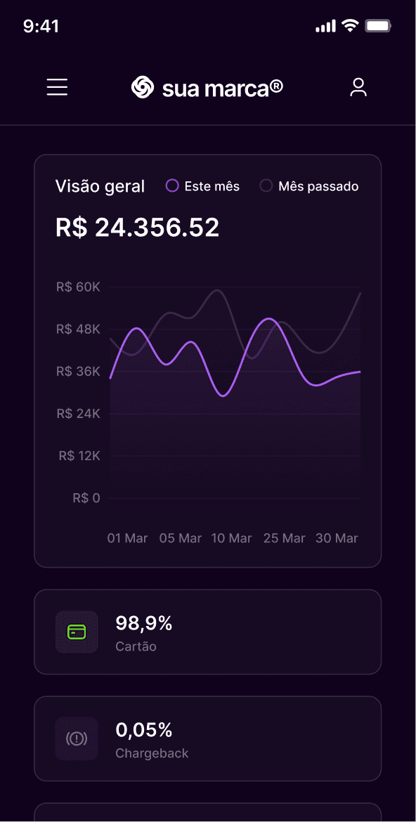 Acompanhe o faturamento bruto, margem líquida, taxas MDR, juros de cartão e lucros.