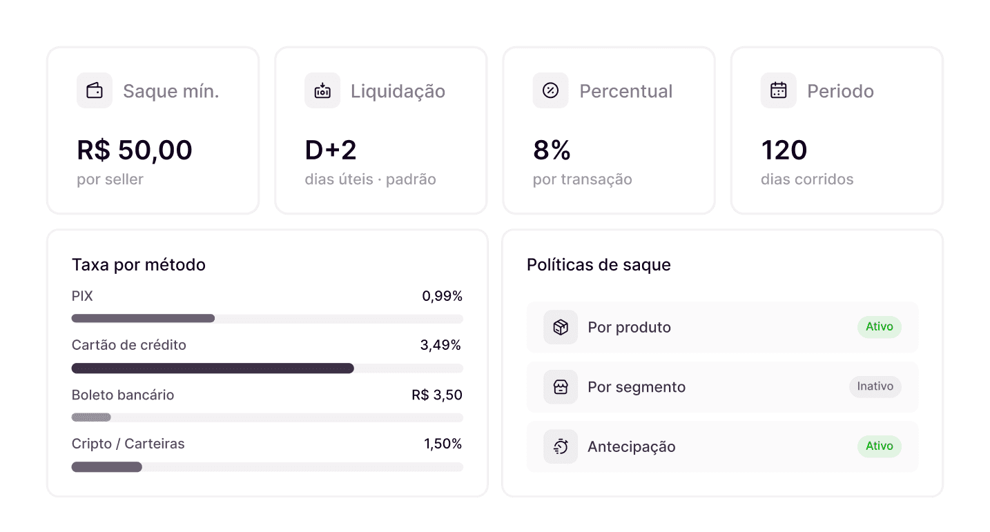 Após a instalação, você receberá acesso ao painel de administração, onde poderá personalizar seu gateway, incluindo logotipo, cores e taxas.